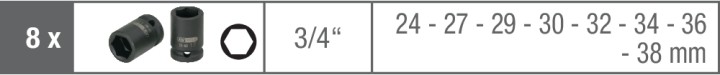 Jeu 8 douilles à chocs, 3/4" | Douilles et accessoires
