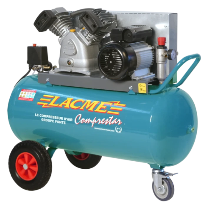 Compresseur professionnel mobile, à entrainement par courroie, monophasé, groupe fonte bicylindre en V : 23 m³/h, sur cuve 100 litres - 11 bar maxi. Avec brancard double, grosses roues et roue directrice avant avec frein, pour un déplacement plus facile. Equipement complet : soupape d’aide au démarrage, sortie directe raccord rapide et épurateur d... Compresseur professionnel mobile, à entrainement par courroie, monophasé, groupe fonte bicylindre en V : 23 m³/h, sur cuve 100 litres - 11 bar maxi. Avec brancard double, grosses roues et roue directrice avant avec frein, pour un déplacement plus facile. Equipement complet : soupape d’aide au démarrage, sortie directe raccord rapide et épurateur détendeur GM avec double sorties.