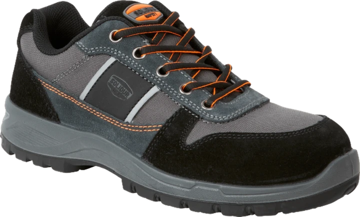 Chaussure de sécurité basse type Basket , Embout et semelle anti-perforation acier, Tige en cuir croûte 1.8/2mm, textile et cuir enduit. Soufflet textile respirant