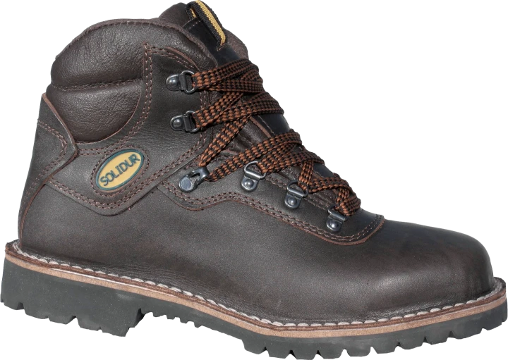Chaussure type brodequin. Dessus cuir à graisser 2.4/2.6mm. Doublure cuir croûte Fermeture par oeillets. Lacets polyamide marron Première de propreté thermoformée